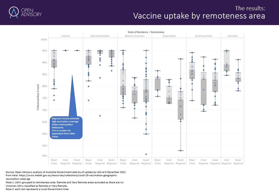 For a current engagement, I was trying to reproduce this analysis of vaccine uptake by remoteness area across Australia, neatly showing the high uptake in rural Victoria.